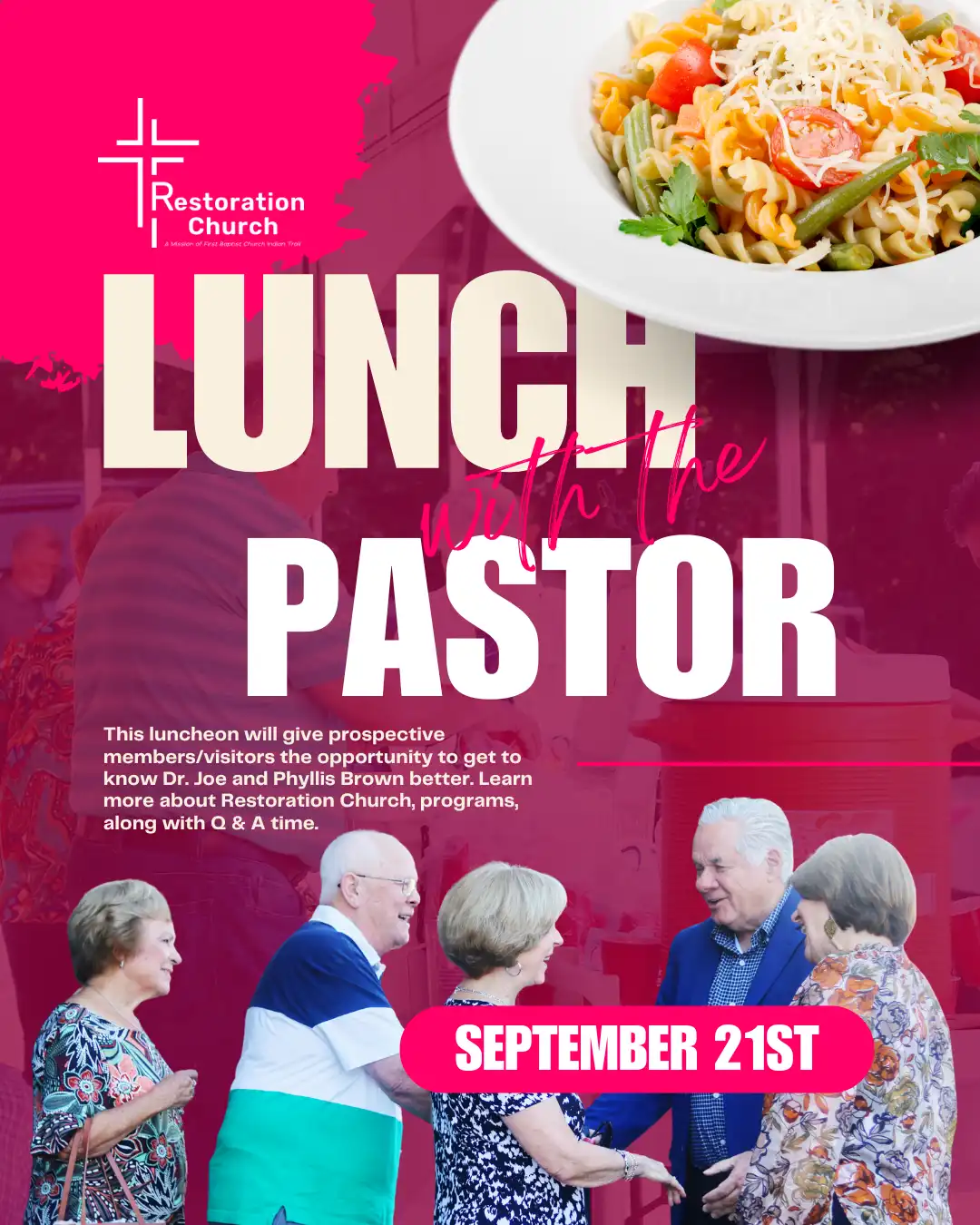 Join us for lunch! At the pastor’s luncheon, you’ll get to connect and learn more about Dr. Joe and Phyllis Brown. In addition, you will have a chance to learn more about Restoration Church, ministries, programs, and have Q & A time.