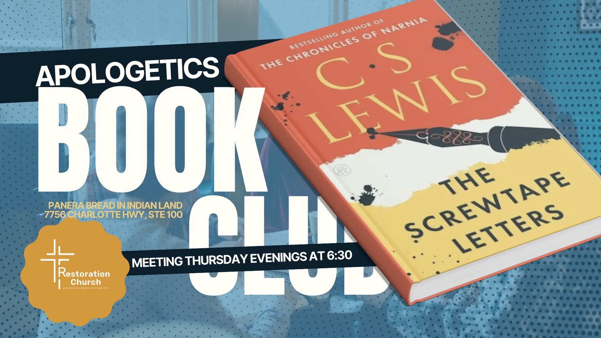 The Thursday night book club meets at 6:30 each week at Panera Bread Indian Land, SC.